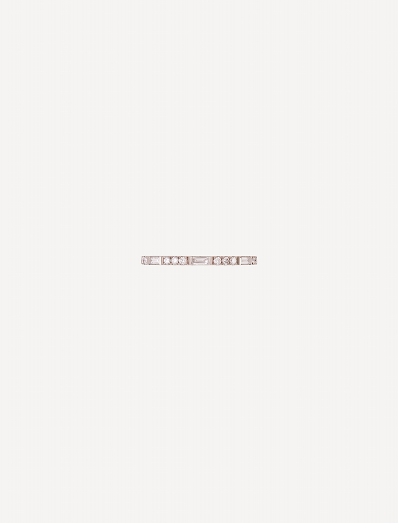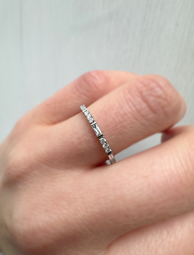 Baguette and round diamond eternity band featuring sparkling lab grown white diamonds. This diamond set band is elegant and the two different cuts compliment each other beautifully.